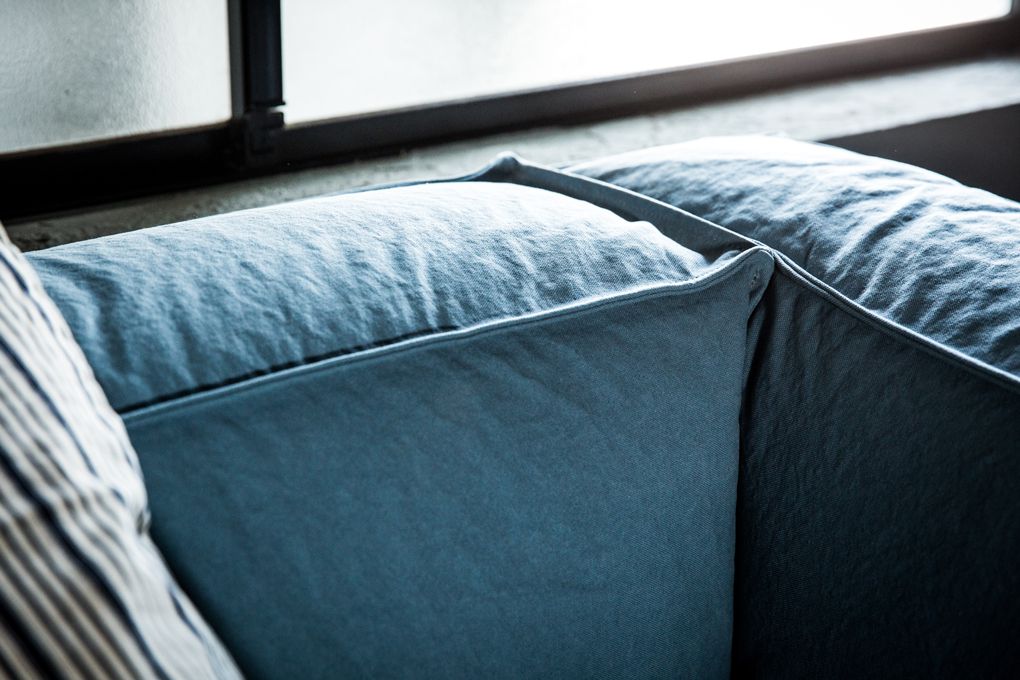 ライトブルーのキャンバス地を張り込んだMANIソファ。