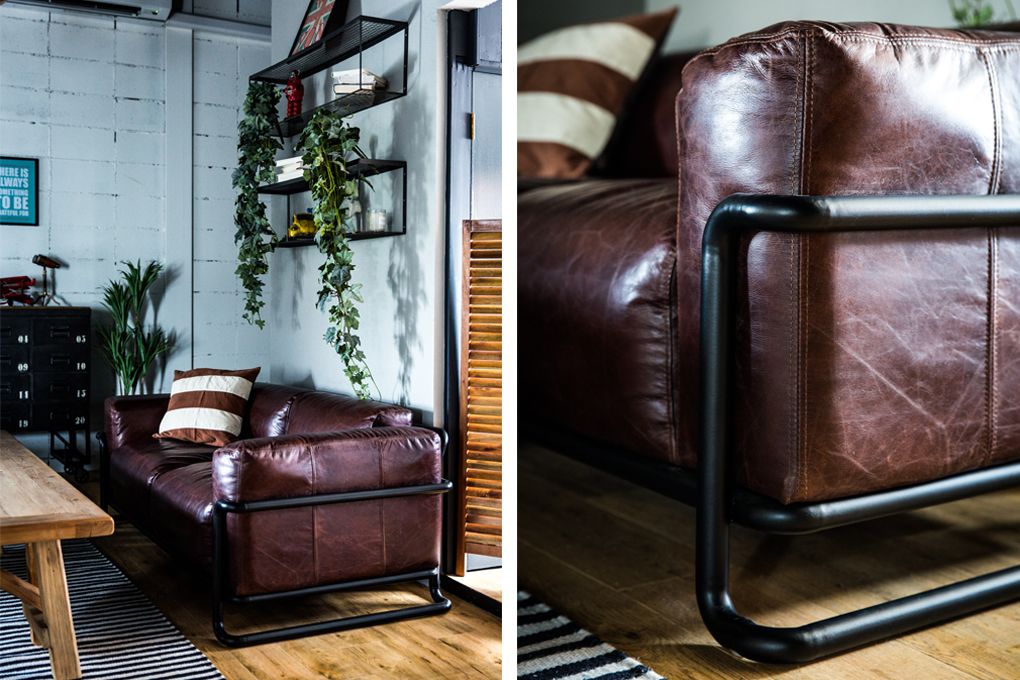 スチールパイプに絡められたレザーソファ。