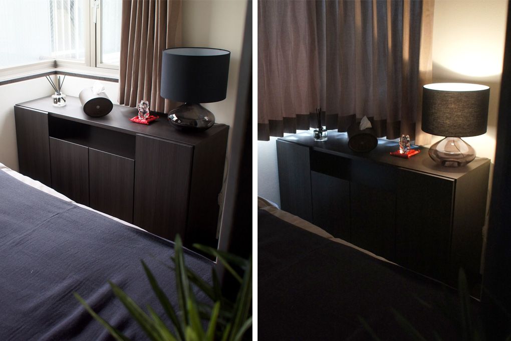 足下には小ぶりなキャビネットとフロアライトで、ムーディーな雰囲気を作るのに一躍買ってくれるはずです。