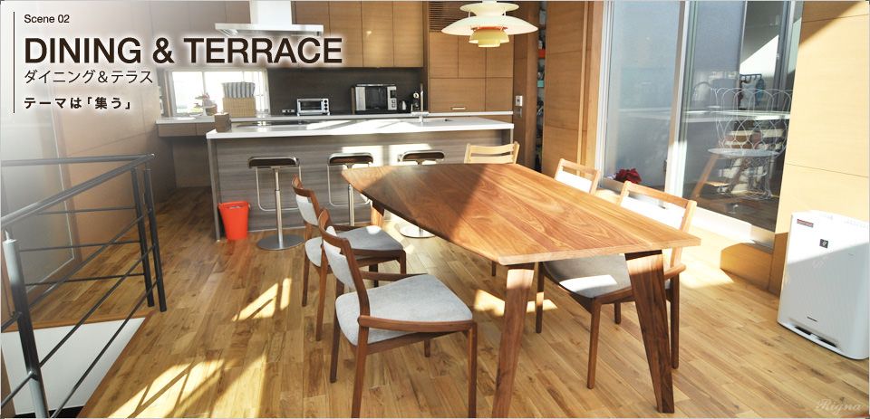 囲むように椅子を置くことができる、まさに「集う」のテーマにぴったりな変形ダイニングテーブル。