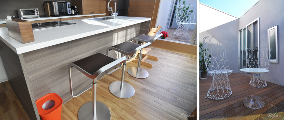 カウンターには、異素材のスツールでモダンの要素も取り入れました。