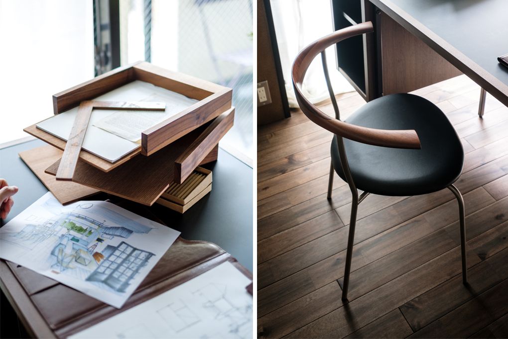 デスク同様にウォールナットで合わせた書類ケースとお気に入りのチェア。