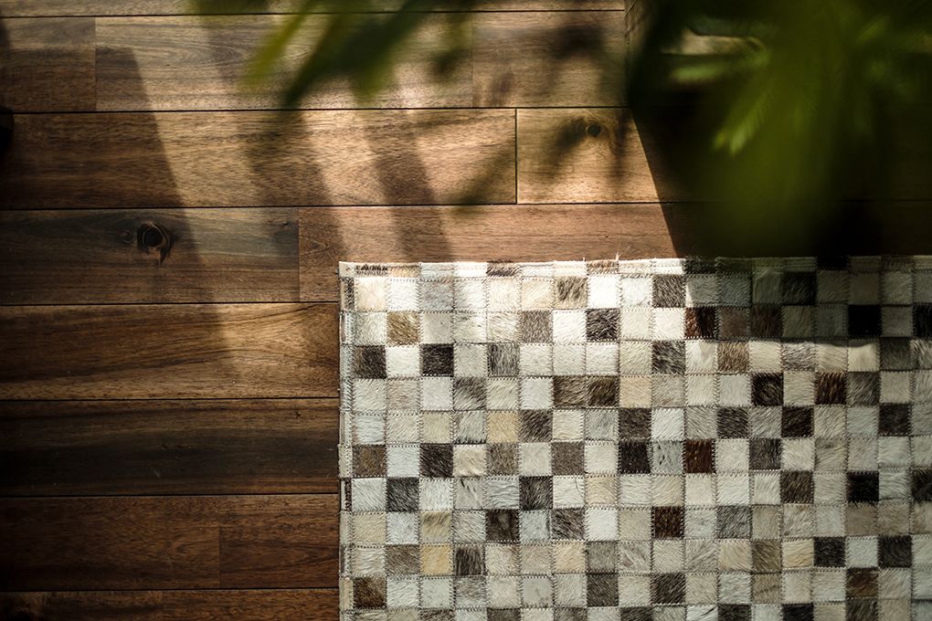 ダークブラウンの床にもアクセントでラグを。牛革がパッチワークになったこちらのラグ。