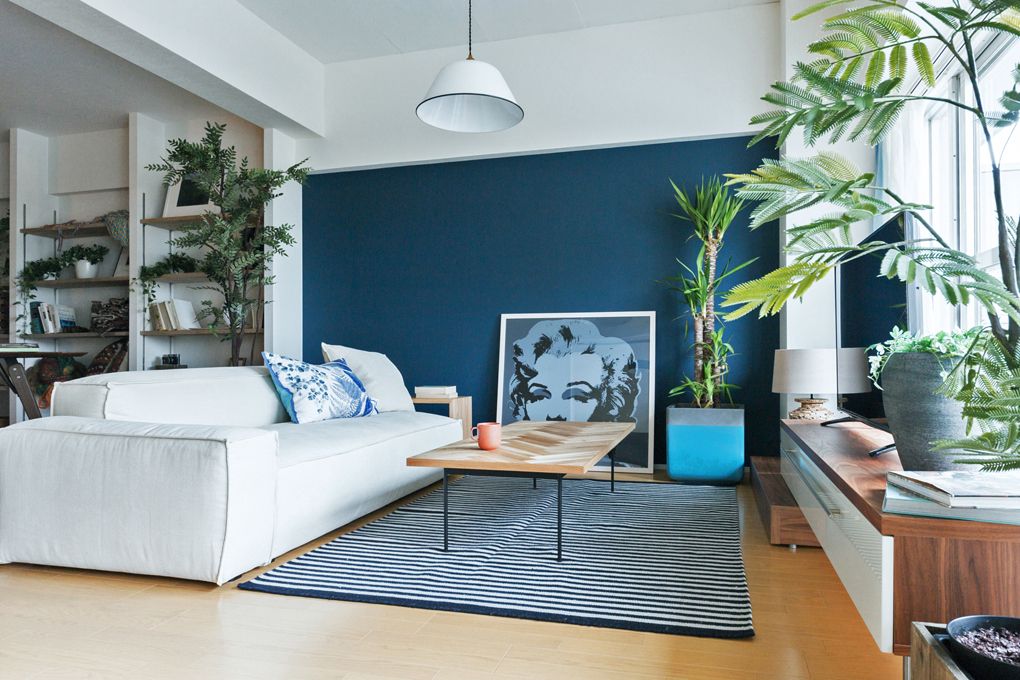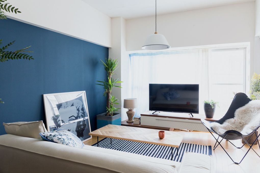 冴えるようなネイビーブルーの壁が目を惹く、リビングダイニングはリノベーションで明るく爽快な空間へ。