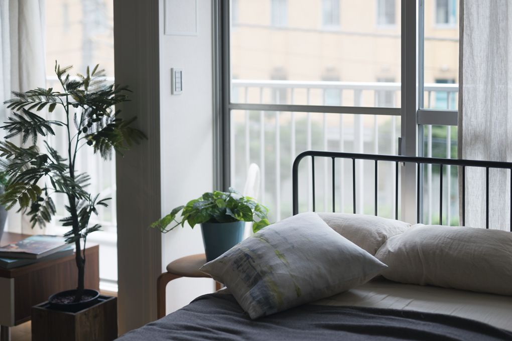 光の通るカーテン、アイアンフレームのルーイベッド、気負わない家具たち。