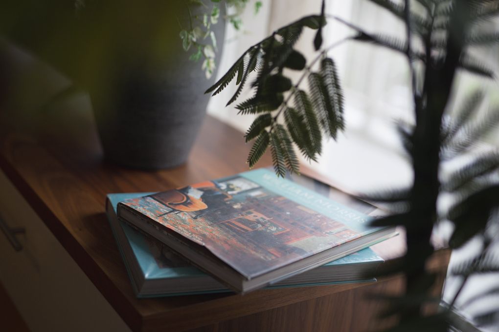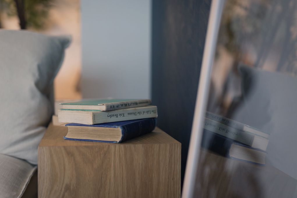幅が広い木のサイドテーブルは使い勝手が良いからなんでも置いてしまうそうすると沢山ある本が、気づけば至る所に進出していく。