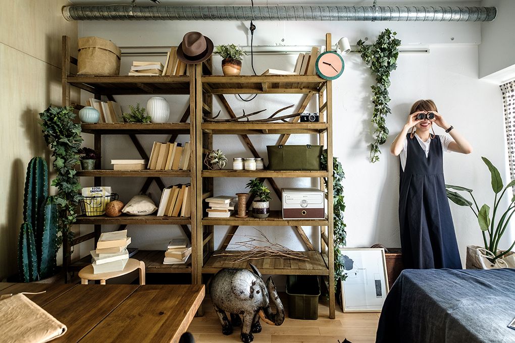 いつもそばにある自慢のシェルフ。杉古材のラフで暖かい感じが気に入っている。