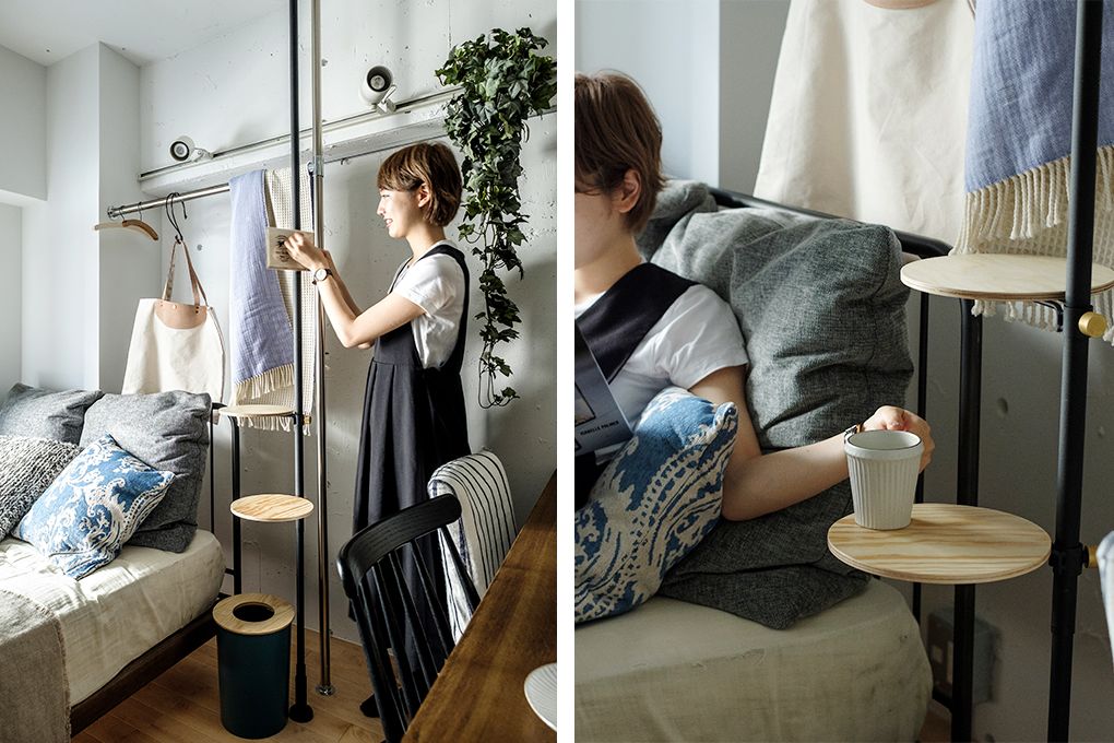 フックやマグネット、ベッドサイドのサイドテーブルなど。