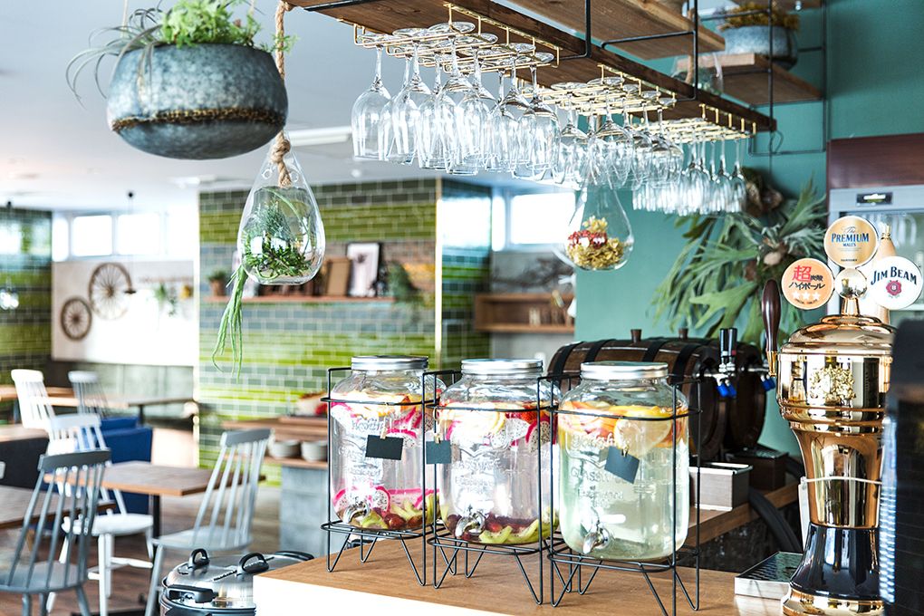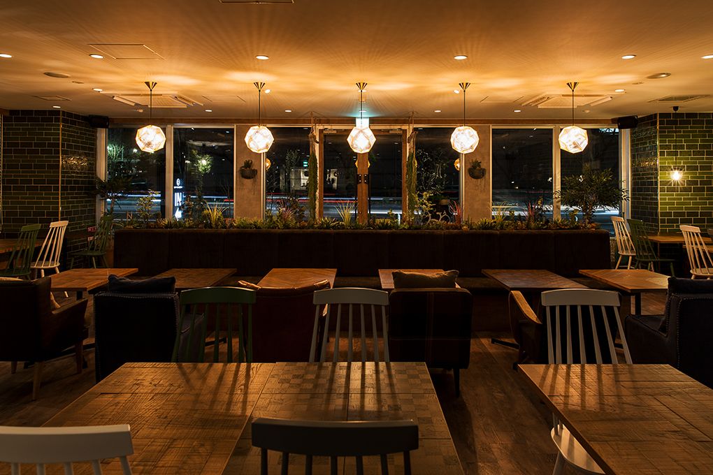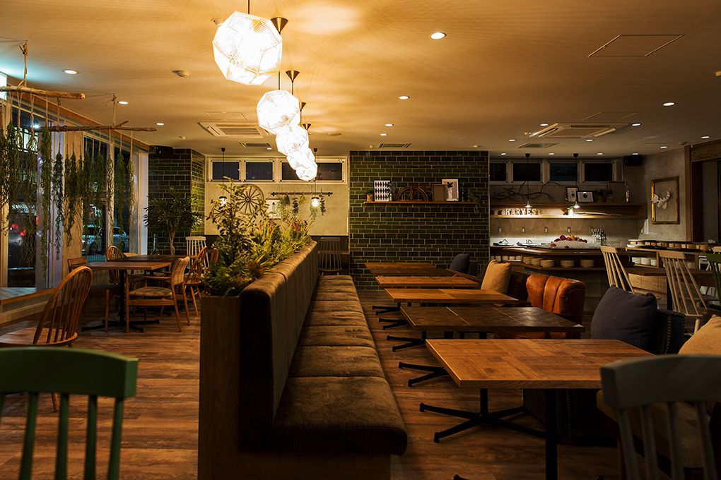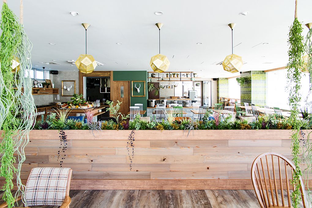 グリーンをふんだんに盛り込んだボタニカルな雰囲気と、モダンな照明器具が織りなすナチュラルモダンなレストラン。