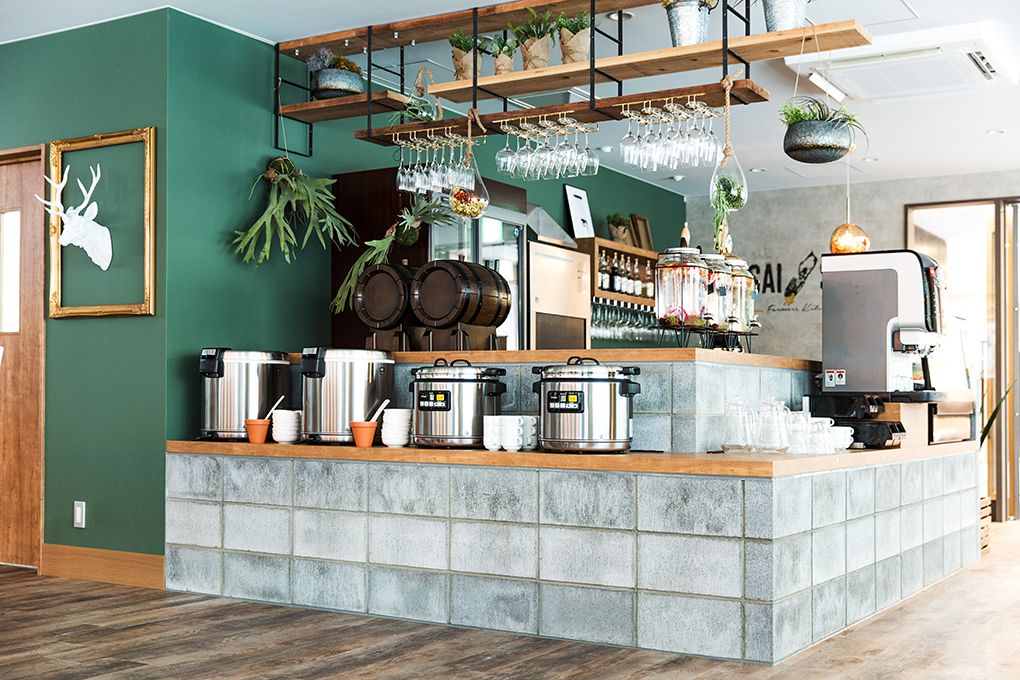 野菜ビュッフェカウンターと合わせてコンクリートブロックが印象的なドリンクカウンター。