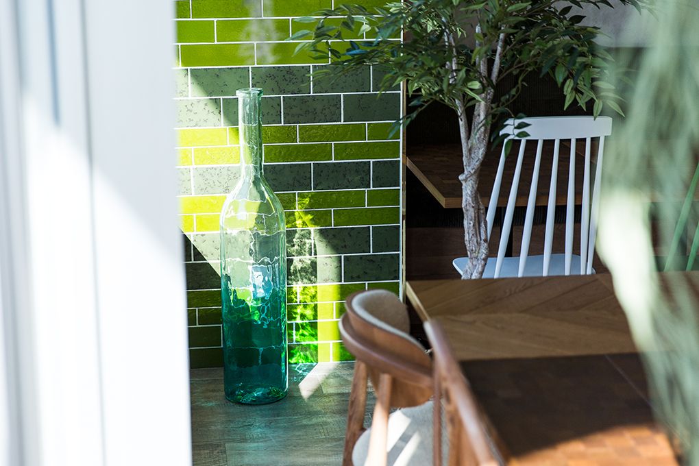 その農場で採れた野菜はきっと新鮮でみずみずしいに違いないと思い、こういった壁面タイルにも新鮮な野菜がもつ水分のイメージを紐づけられたらとチョイス。