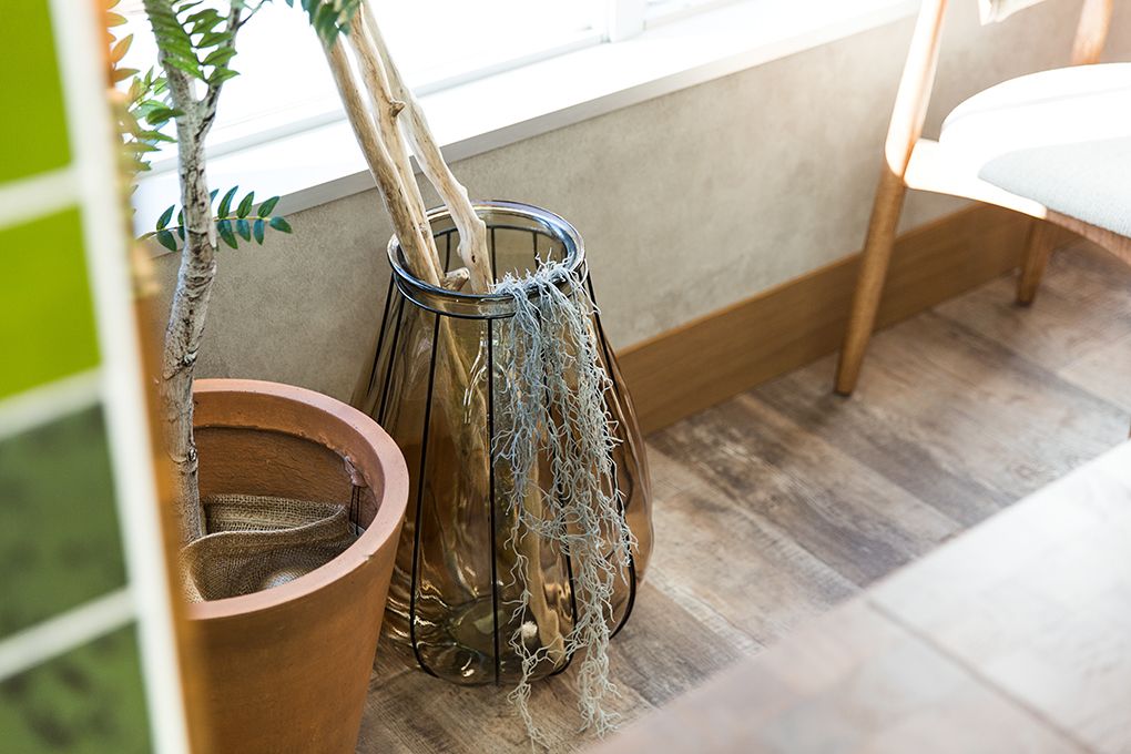 違うところには流木をさしたブラウンガラスのディスプレイも。
