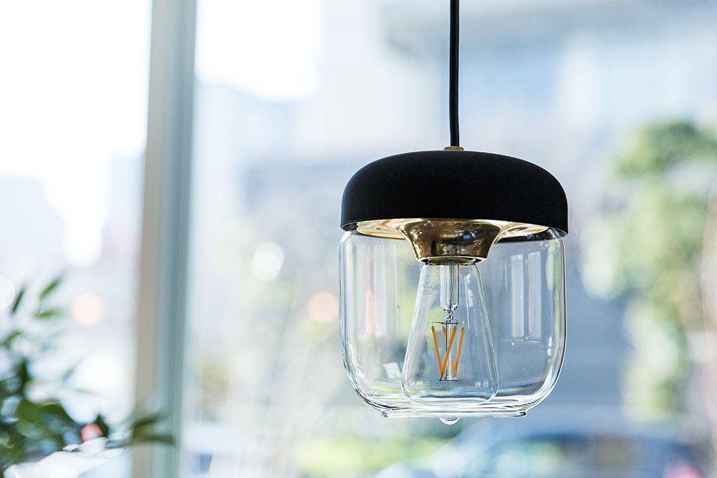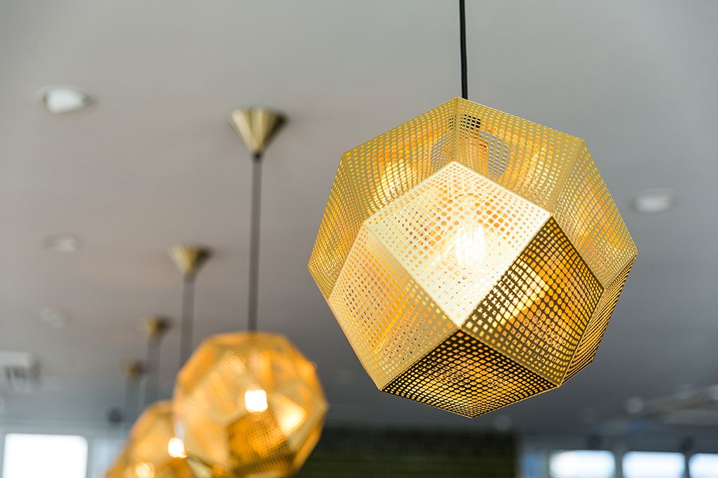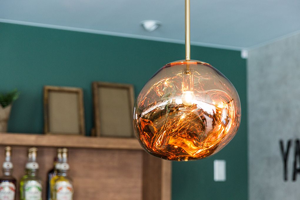 グリーンが彩り、アクセントとして映えるゴールドのペンダントライト。