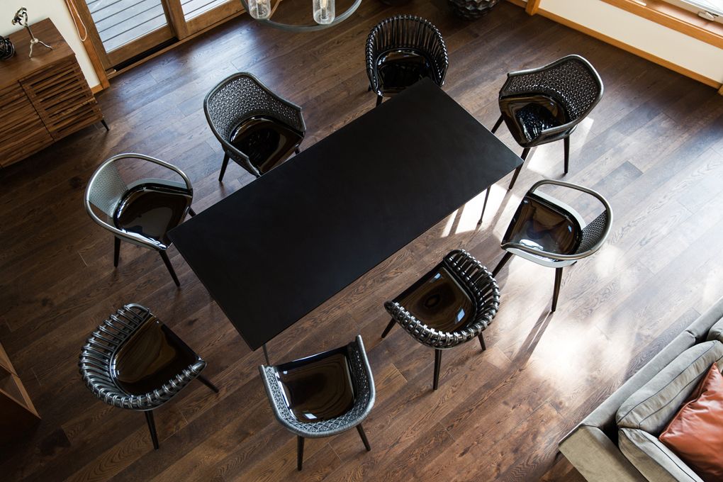 照明のシェード・BKFチェア・トラセンターテーブルのレザーまで、ブラックカラーで統一してますが