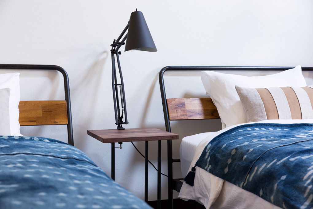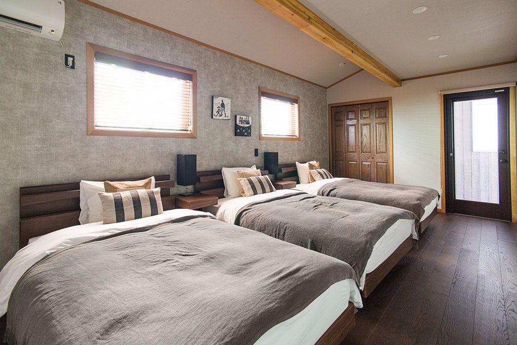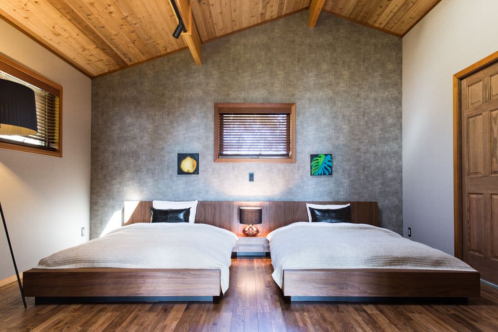 ウォールナットのベッドが3台連なる寝室は、木のぬくもりと重厚感でゆったりとした空気感が漂います。
