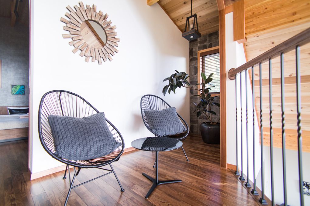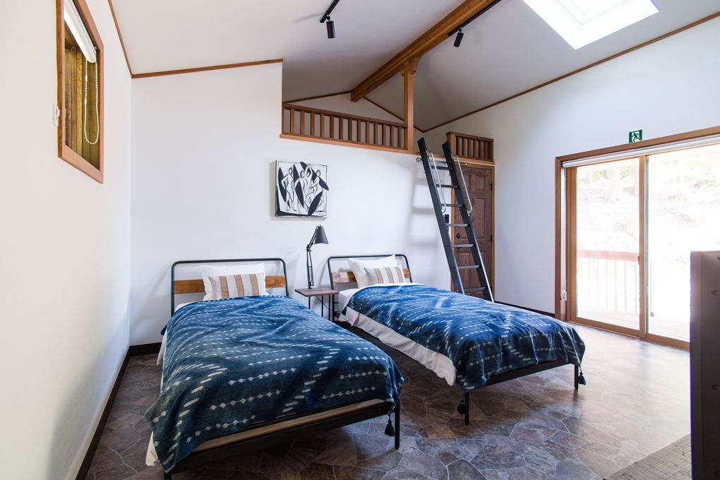 古材とアイアン素材が効いた、ラフな印象のロフト付きの離れの一室。