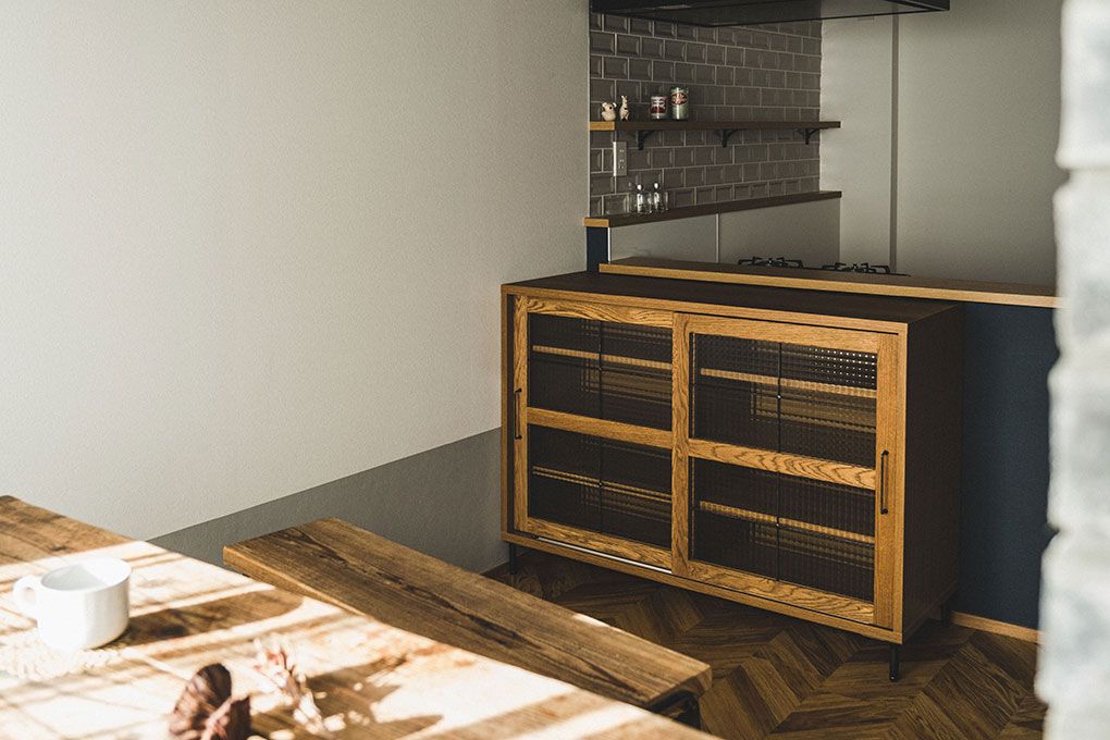 キッチンボードと小棚、お気に入りのアイテムを魅せるキッチンシーンの出来上がりです。