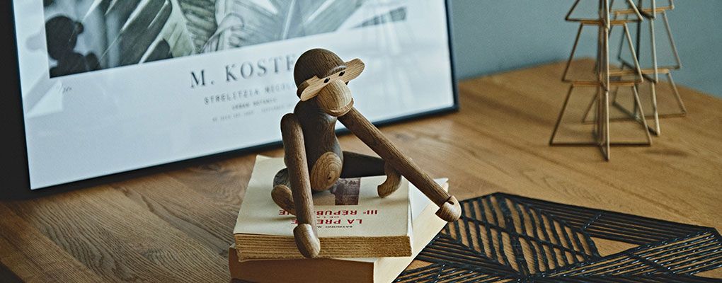 テーブルの上には、ボタニカルのポスターとモンキー。
