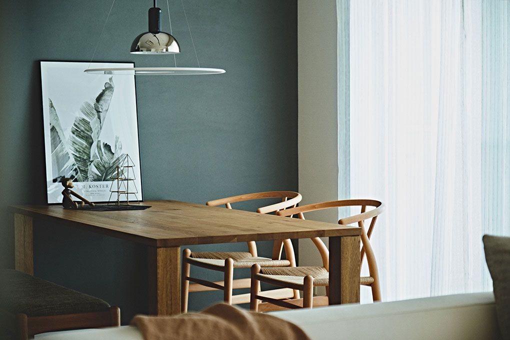 ノルディックスタイルでまとめた家具に、ミッドセンチュリーの照明。