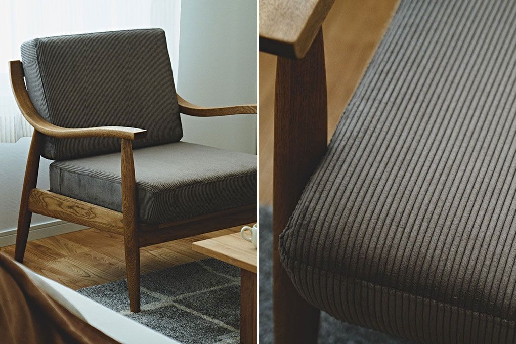 チャコールグレーのコーデュロイ生地で張った1Pソファ