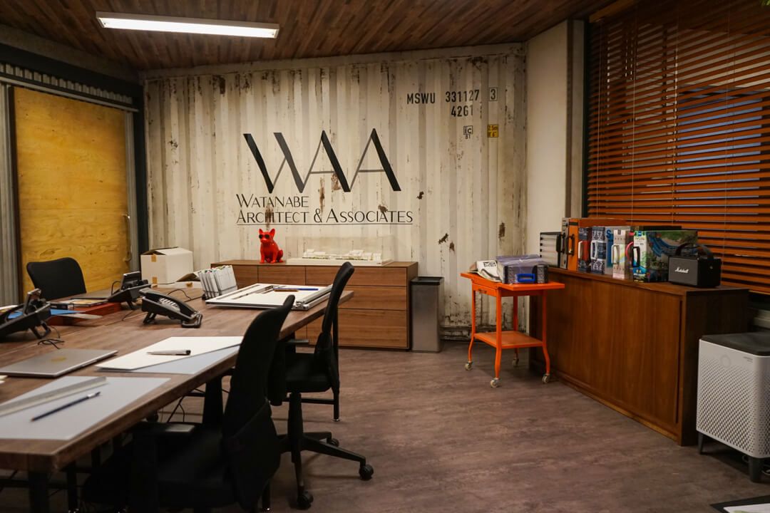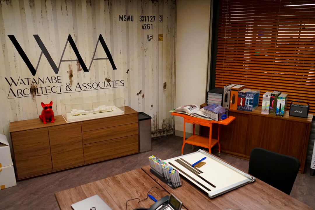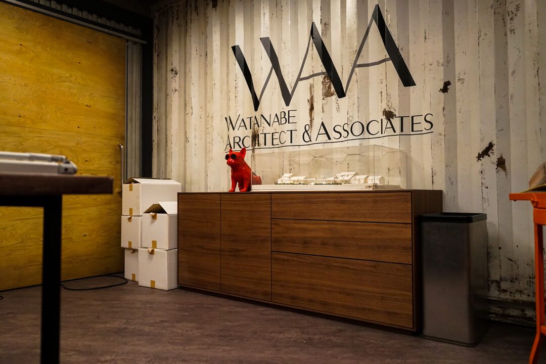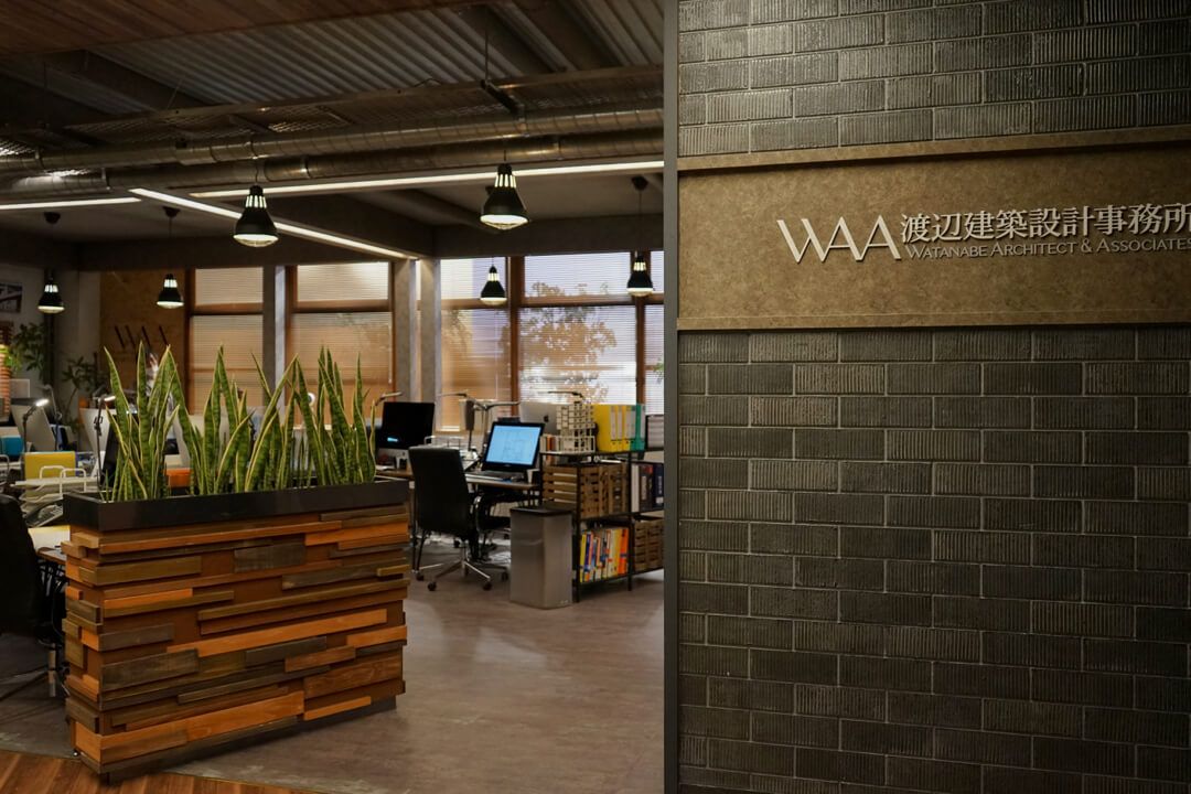 オフィスを奥まで入って行くと壁にはWAAという設計事務所のカッコいいロゴ!