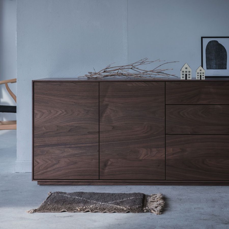 C&Cは、日常のさまざまなものをまとめて収納でき、暮らしに自然に馴染むデザインのキャビネットです。左半分は可動棚付きのキャビネットで、雑誌や文庫本、日用品、食器や救急箱、ちょっと捨てられない小物まで、さまざまなものを整理できます。右半分の3段チェストは、上段が浅く文具や充電器、アクセサリーなどの小物収納に適し、中段はDVDケースや衣類(下着・シャツなど)を収納でき、下段は最も深く、ブランケットやニット、アイロン、トイレットペーパーなどかさばるものも収まります。A4サイズの本も収納可能で、日々の暮らしの細かな収納ニーズに柔軟に応える設計です。