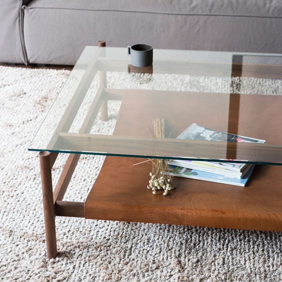 植物タンニンなめしの厚革を、無垢材のフレームに棚板のようにわたしたローテーブルです。革は時間をかけてじっくりとなめしたオイルヌメを使用。はぎれを縫い合わせたものではなく、牛一頭からとれる革の半分、一般的に「半裁」と呼ばれる大きな革から切り出したものをそのまま使っています。