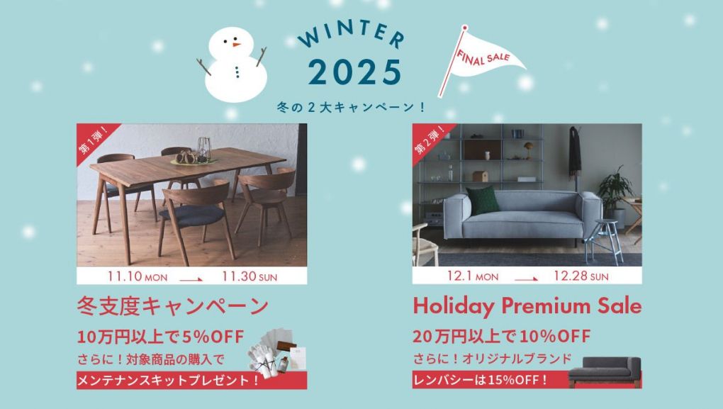 年末にかけて、2つのスペシャルキャンペーンをご用意しています。期間限定の特典や割引を活用して、あたたかく快適な冬の空間づくりや、春の新生活に向けた家具選びをお得にスタートしましょう◎