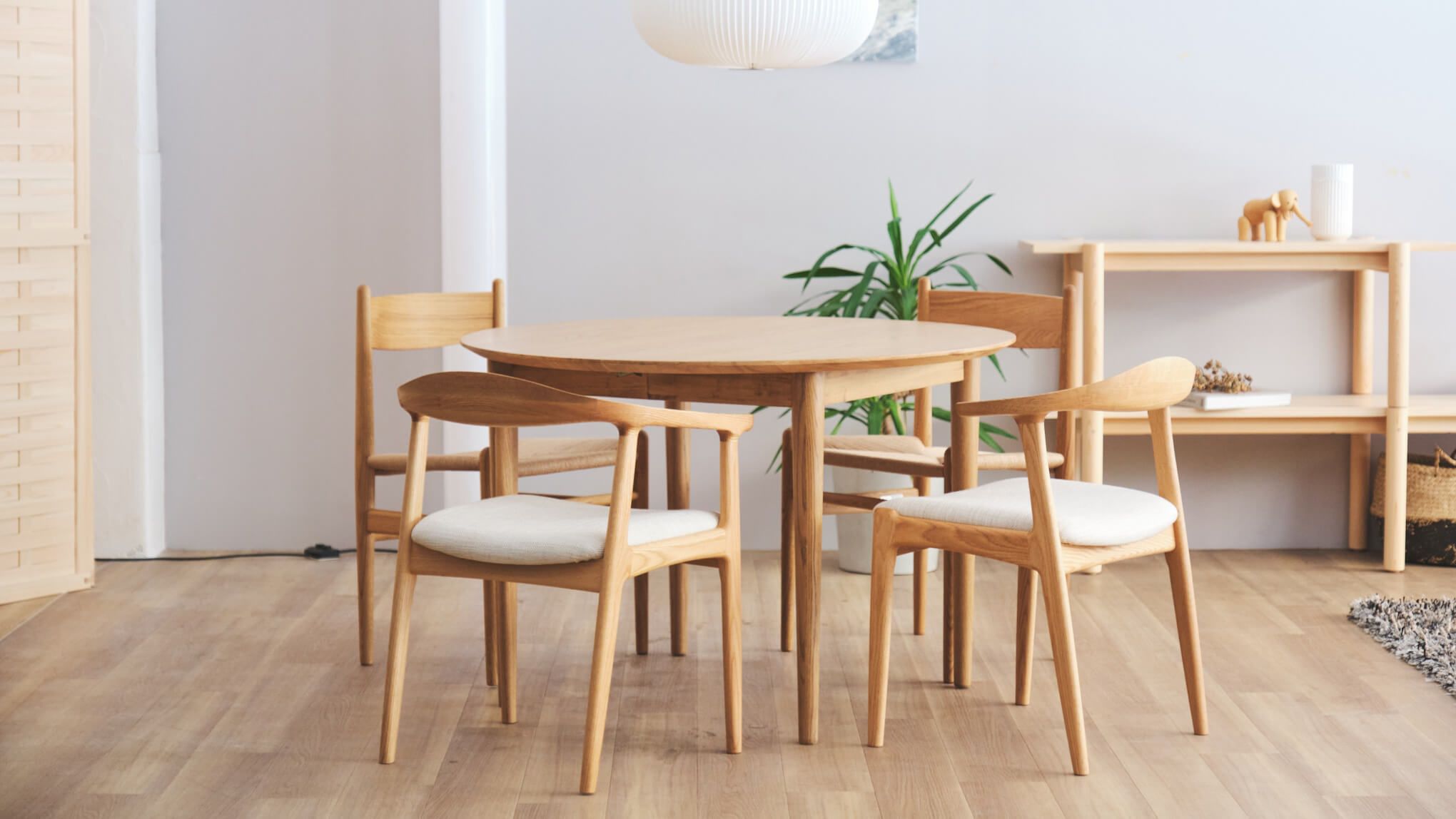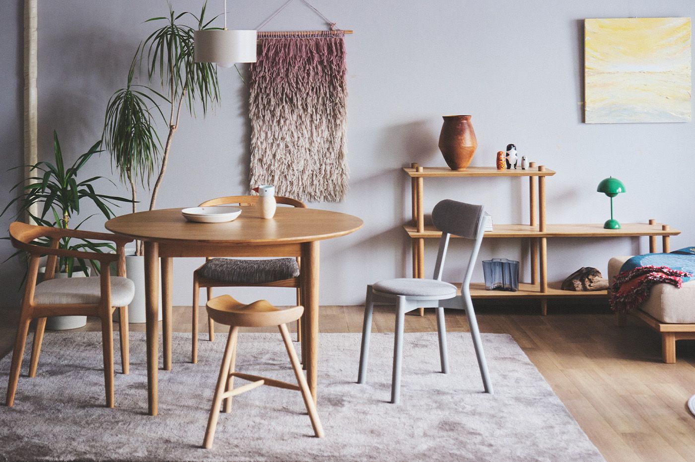 無垢素材を生かした、シンプルで素朴な雰囲気が特徴のシキファニチアの椅子やダイニングテーブル。