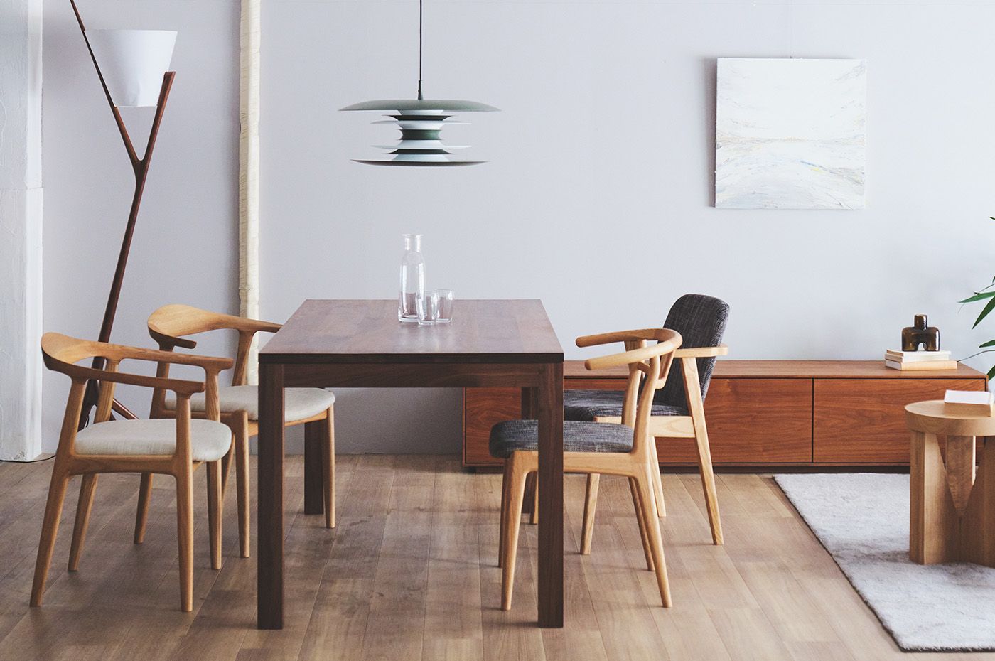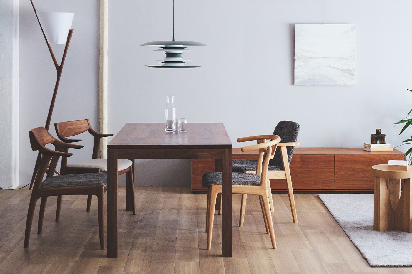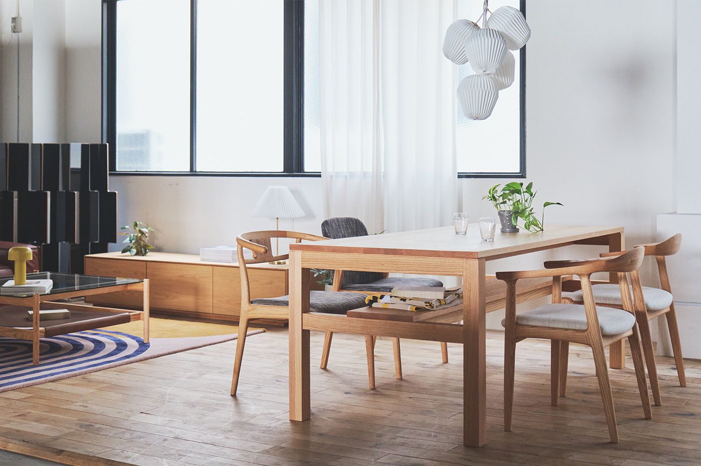 すべての加工を国内の工場で行い、素材に使用されているのはオークやウォールナット、チェリーといった銘木。360°どこから見ても絵になり、職人の手と目で一つ一つ仕上げられているから細部の仕上がりも丁寧。座り心地の良さにも定評があります。