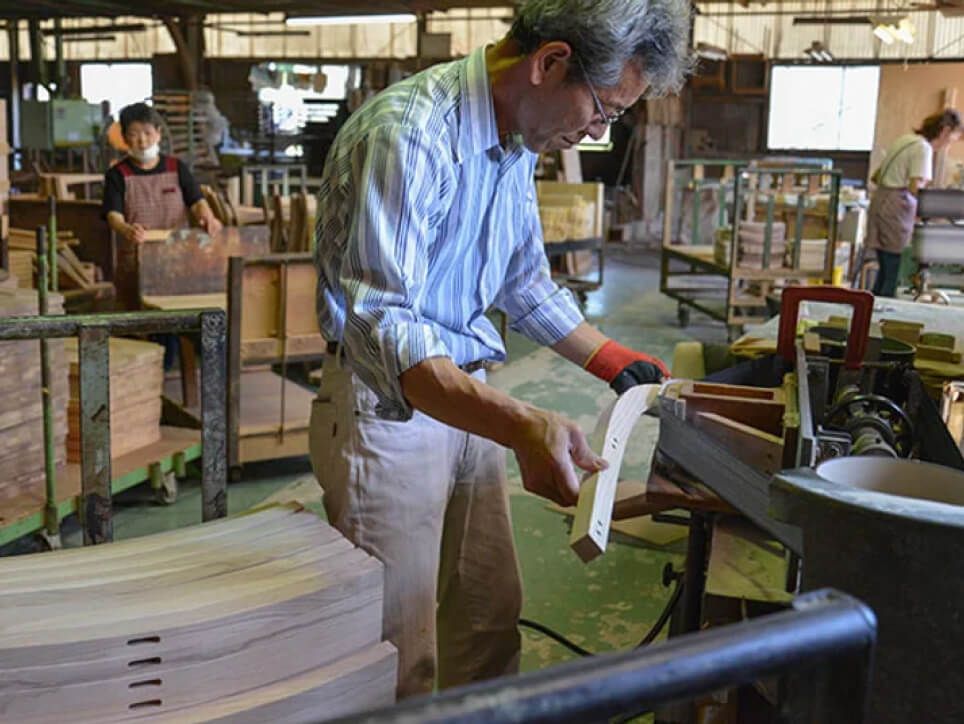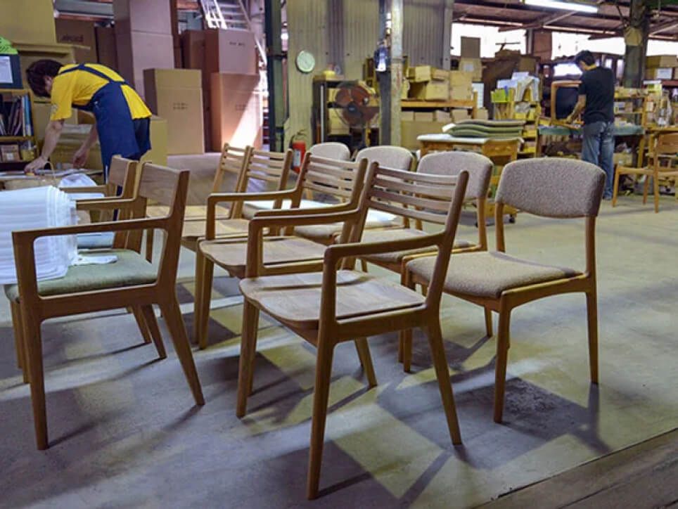 シキファニチアは、福岡県の郊外にある小さな家具工場。木製椅子を得意とするメーカーで、木取りから塗装、張り作業まで一貫した自社生産を行っています。