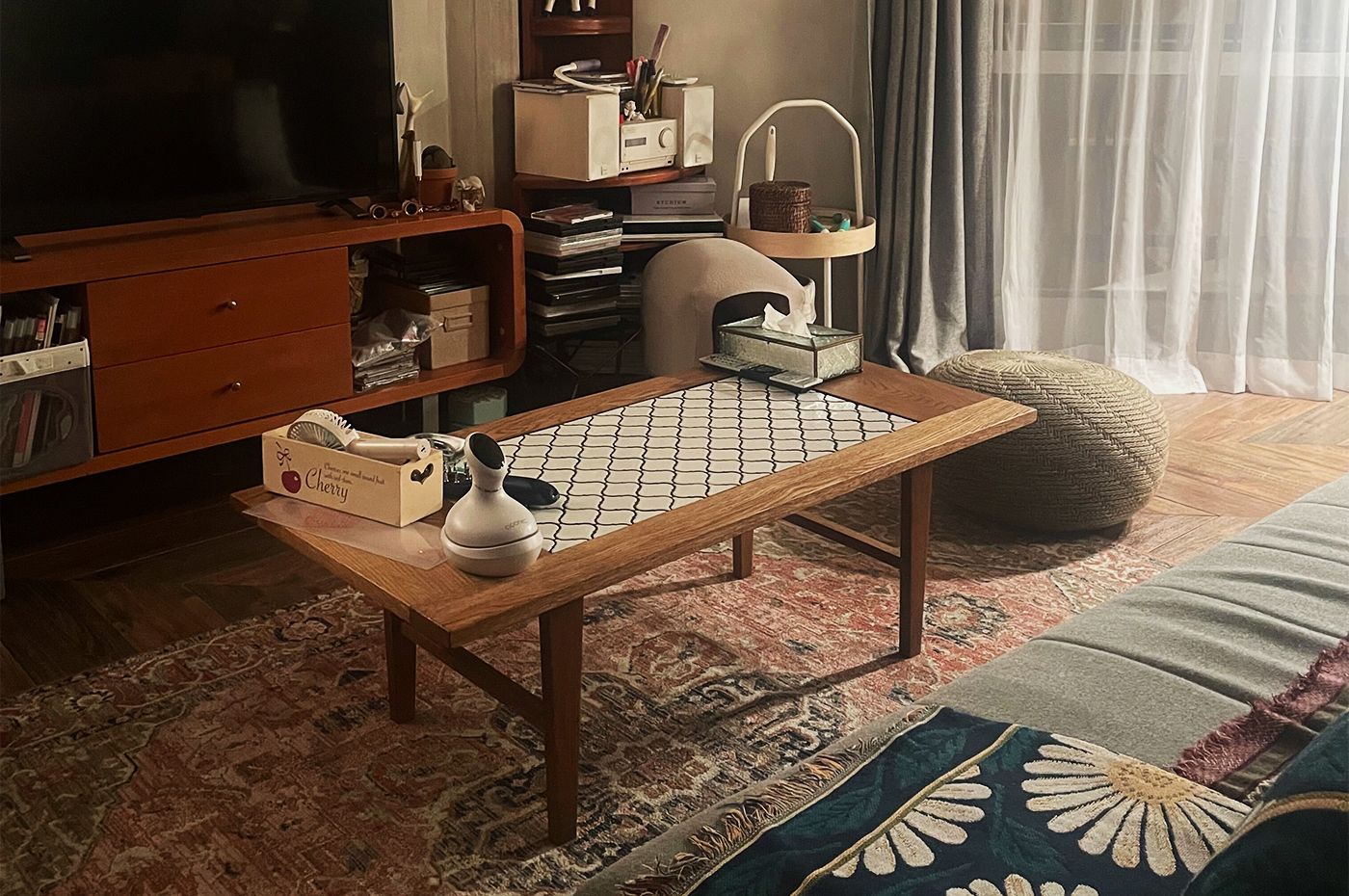 ホワイトタイルとオークの組み合わせがおしゃれで、北欧っぽいインテリアにできると人気のリビングテーブルです。