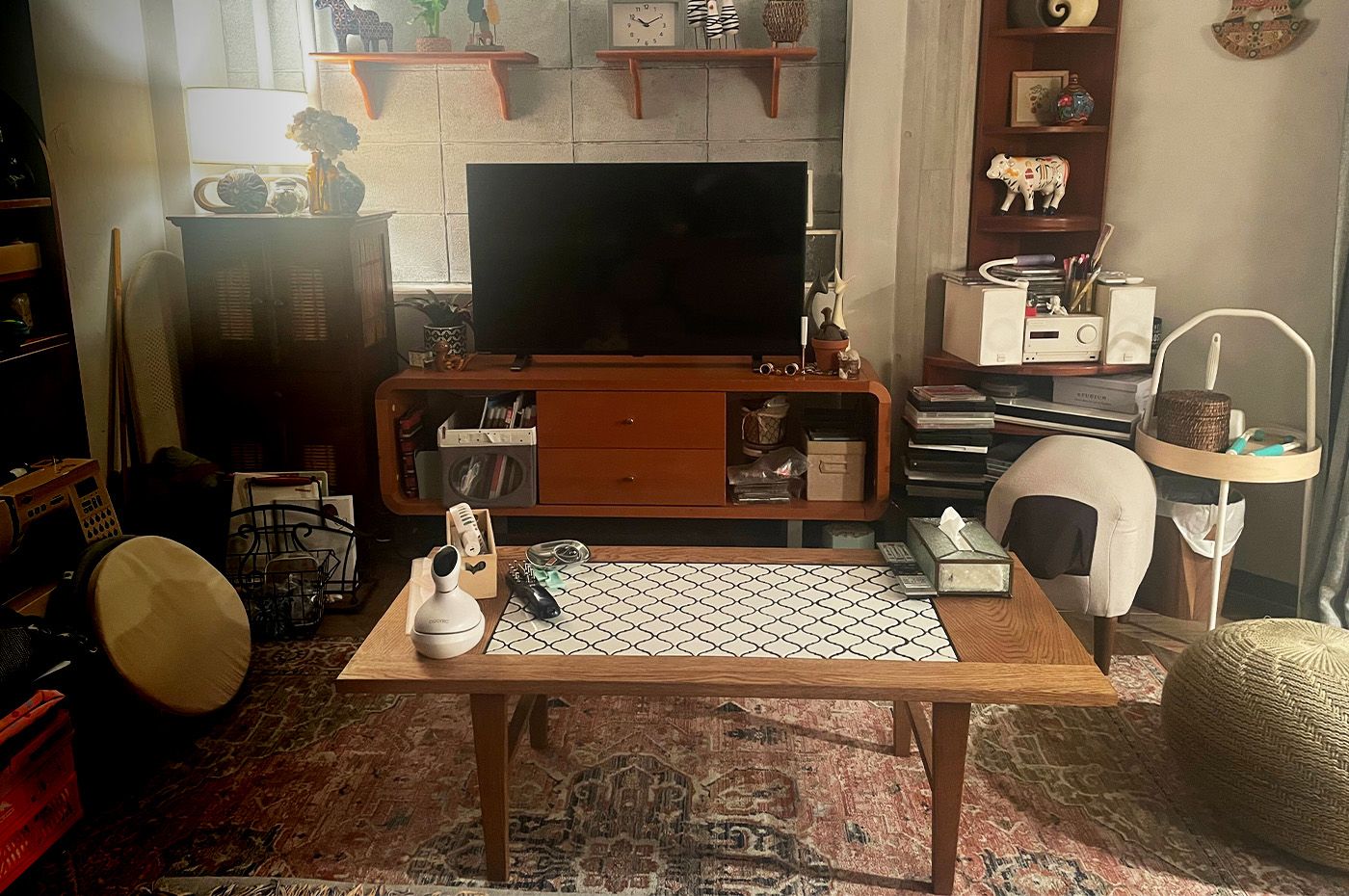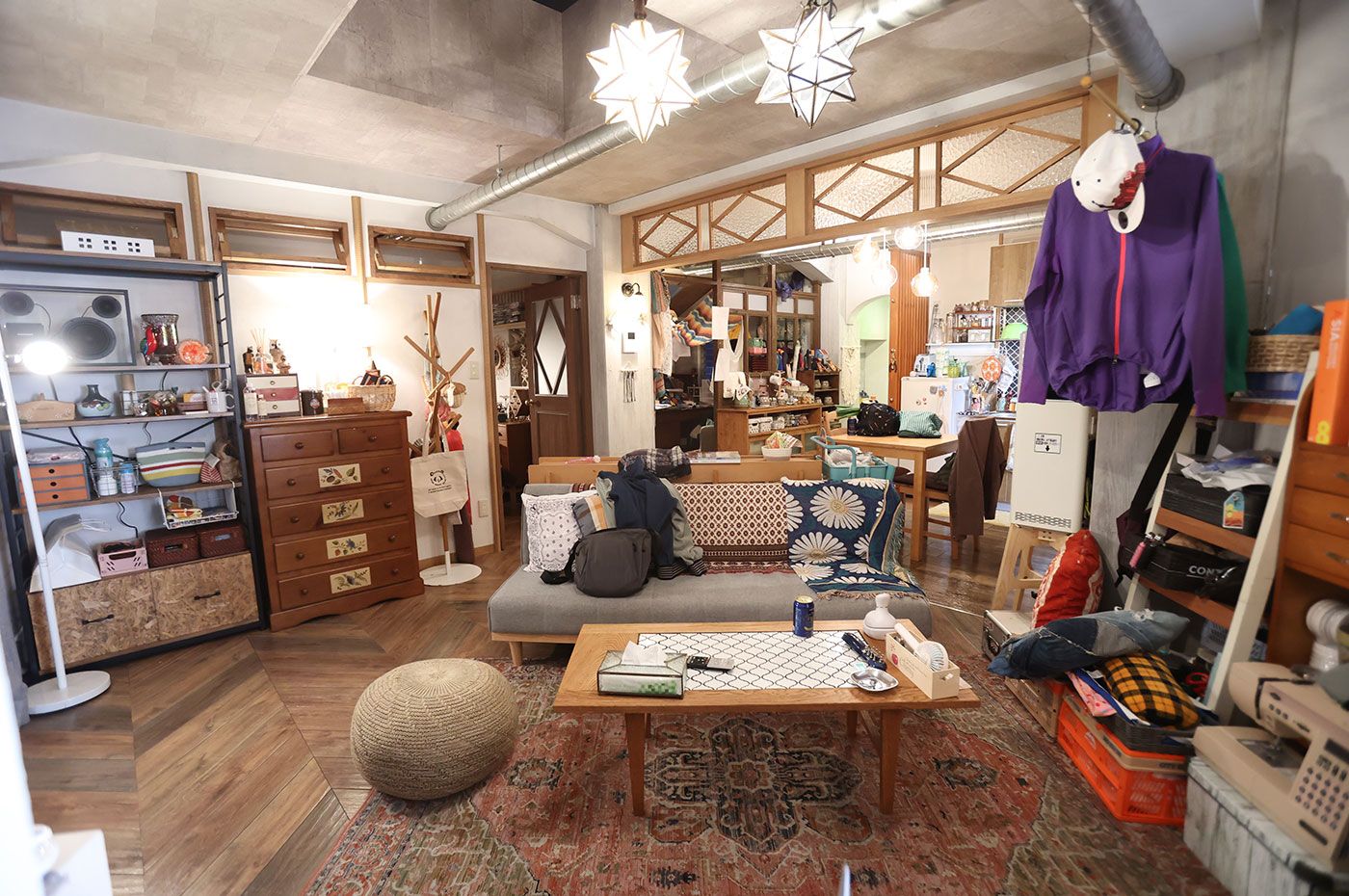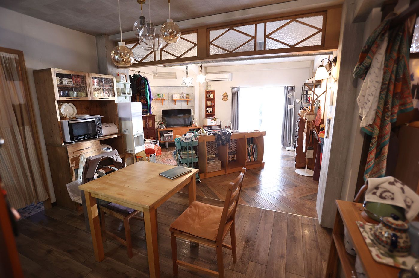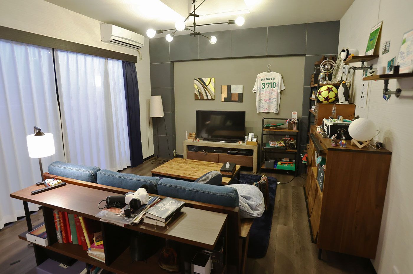 広めのリビングスペースは個性的な照明とカラフルな小物に囲まれていて、明るくにぎやかな空間。
