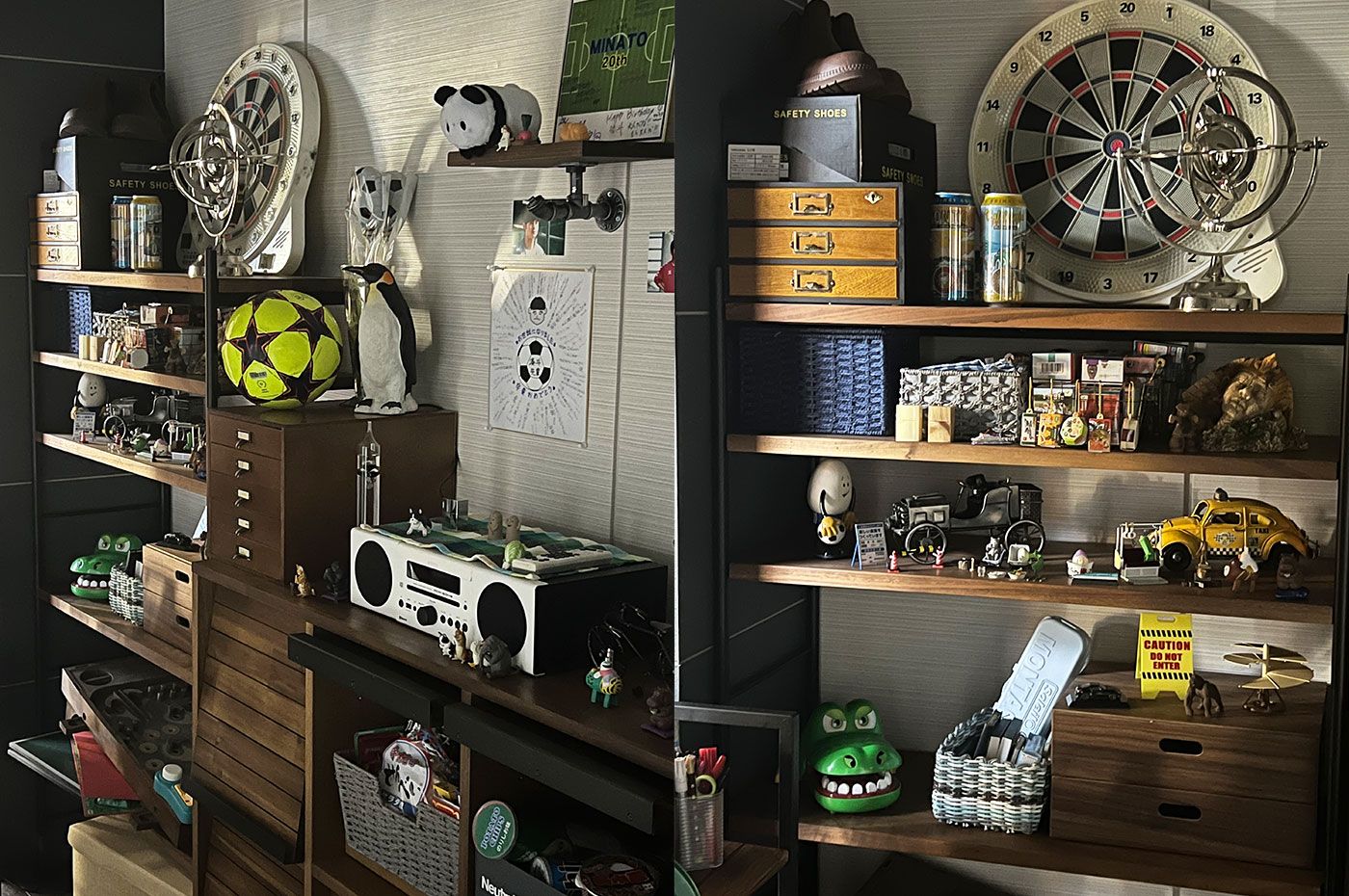 テレビ横の「アリーシェルフ」にはダーツや小物が賑やかに飾られています。