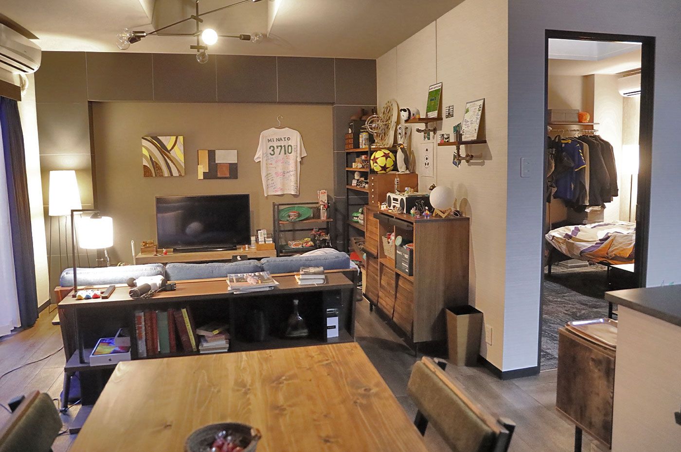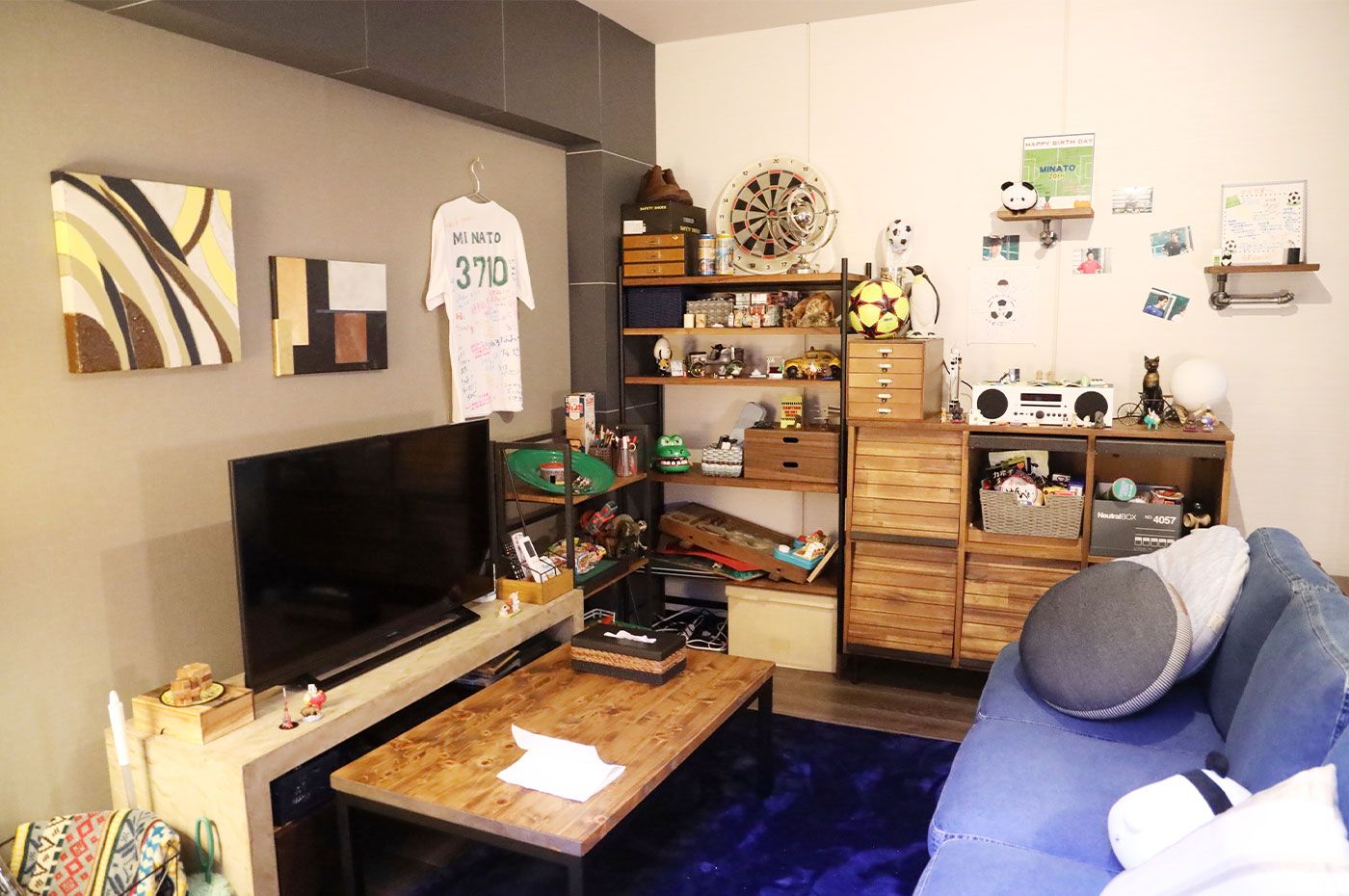 湊斗のお部屋はアイアン素材をポイントで取り入れている家具が多く設置されているので、カーディナルペンダントライトのブラックアームがお部屋によく馴染んでいます。