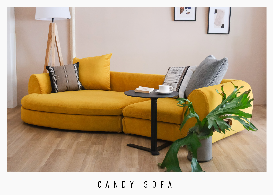 丸みのあるカウチサイドはとても広く、深く腰掛けると足を伸ばして座ることが可能です。L字ソファよりも省スペースでくつろぎ空間ができると人気のソファです。