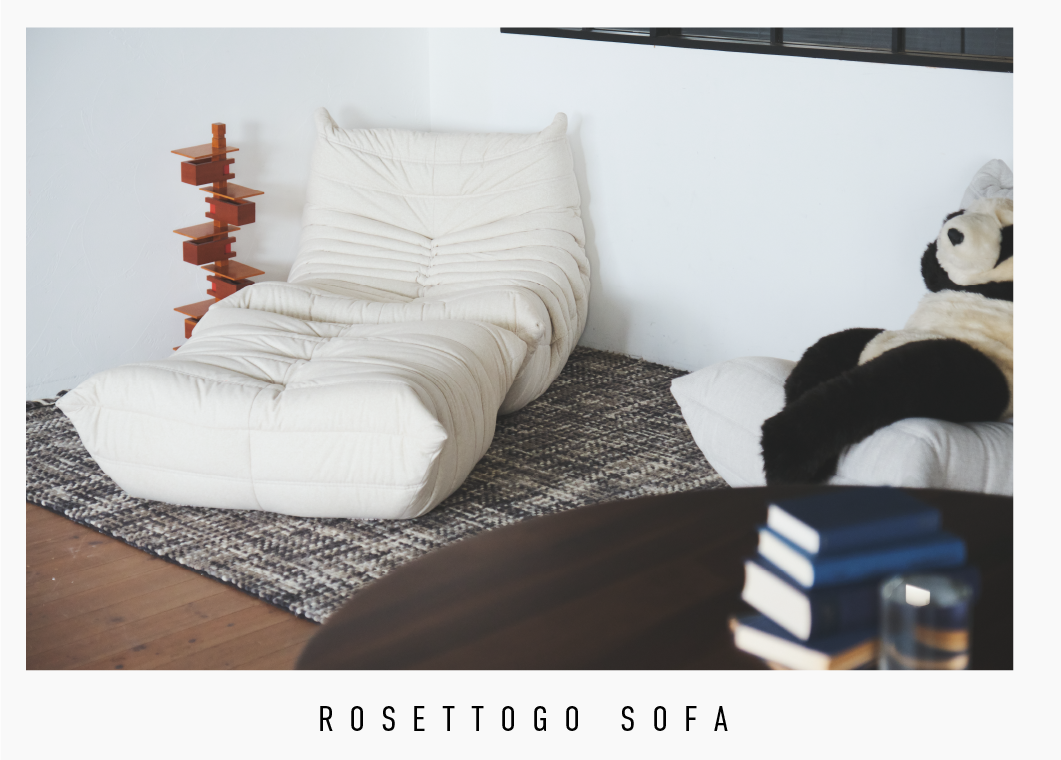 雑誌やSNSで人気を博す「ロゼトーゴ」ソファ。見たことあるという方も多いのではないでしょうか。ロゼトーゴは鉢の腹をイメージしてデザインされています。体が当たる部分に合わせて違う固さのウレタンを使使い分けていて、座り心地がいいのにヘタりにくい、バランスのとれたソファです。