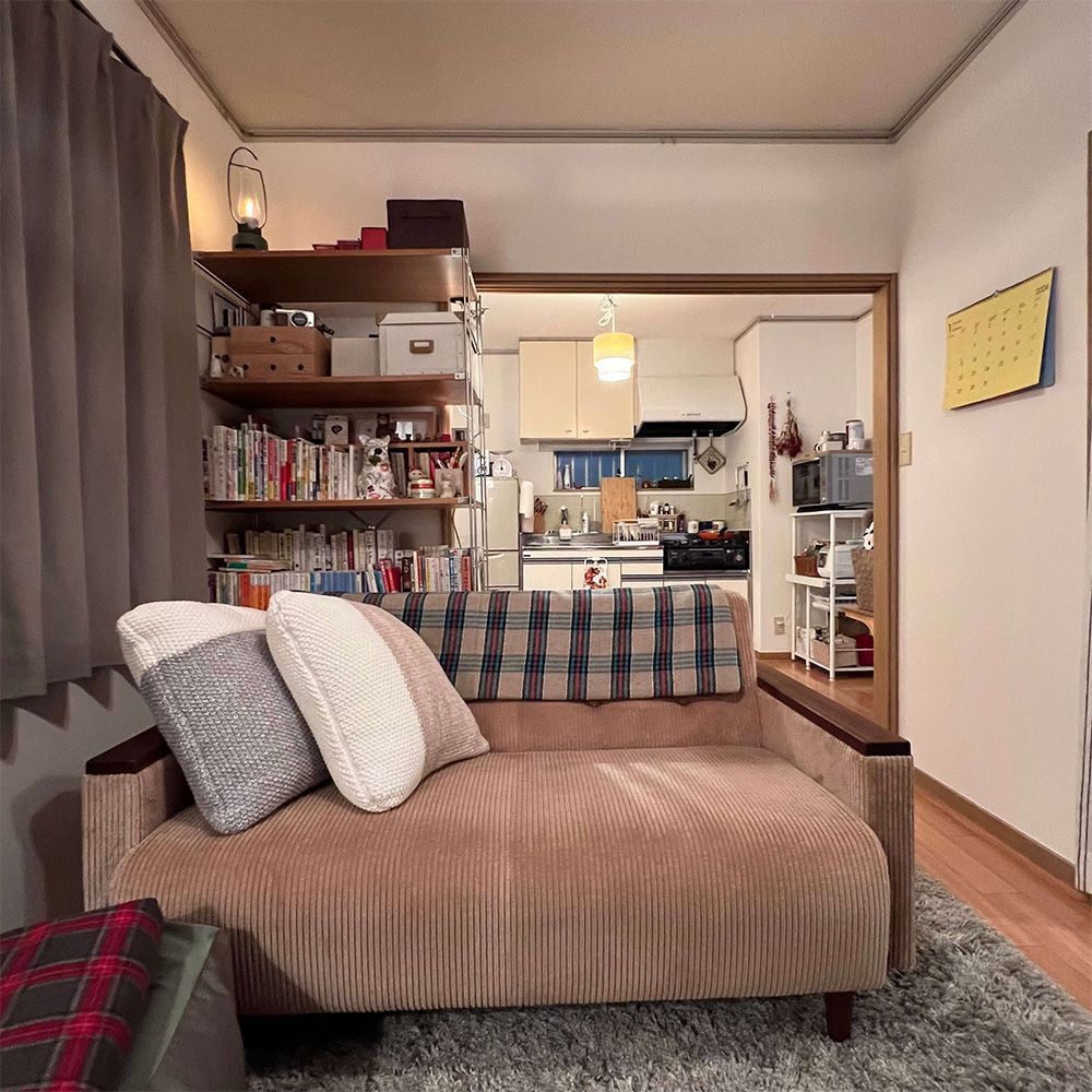リビングルームのソファには愛らしいフォルムの「ウォールナットソファ」が採用されました。