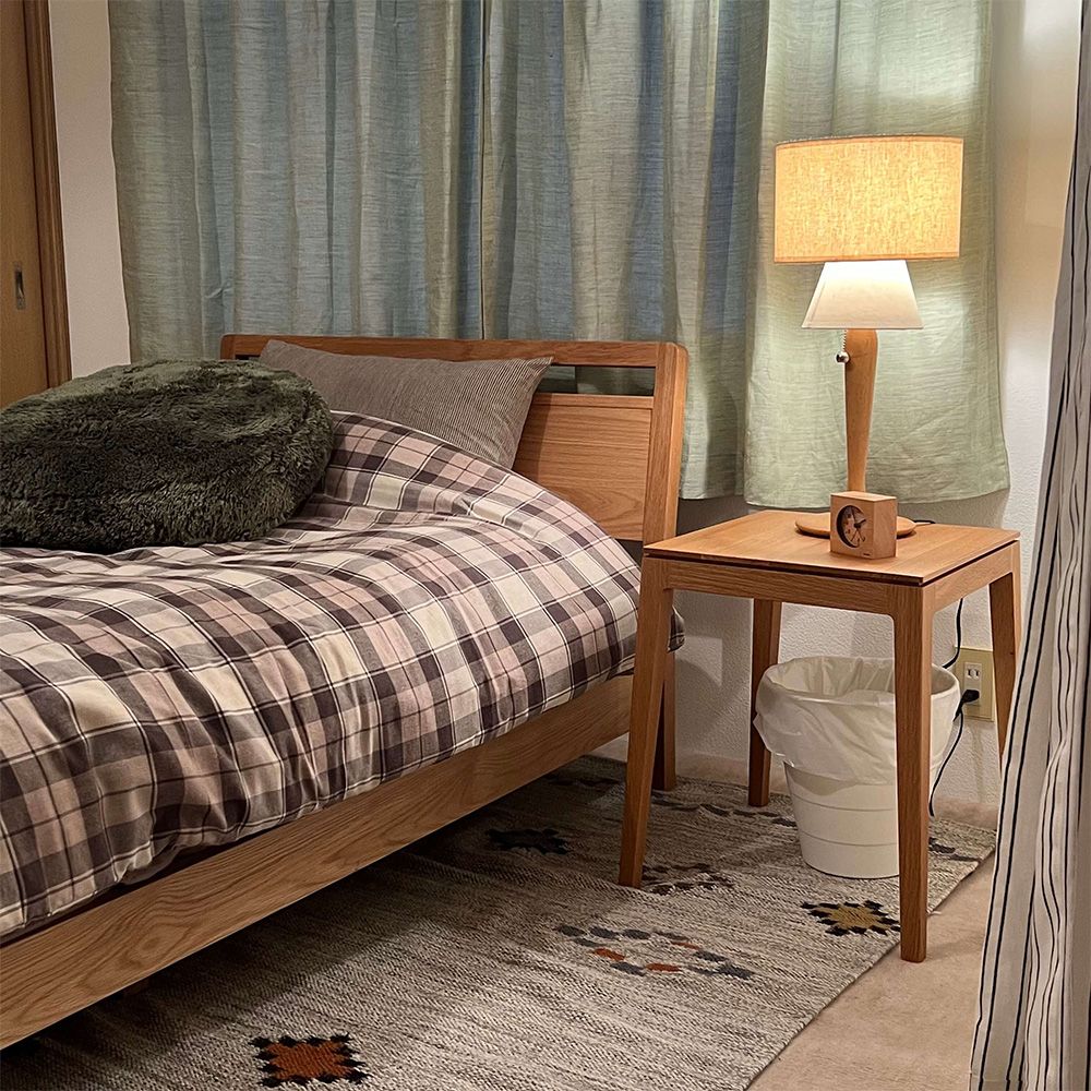 ナイトテーブルもオーク材の家具なのでお部屋に統一感がありますね。