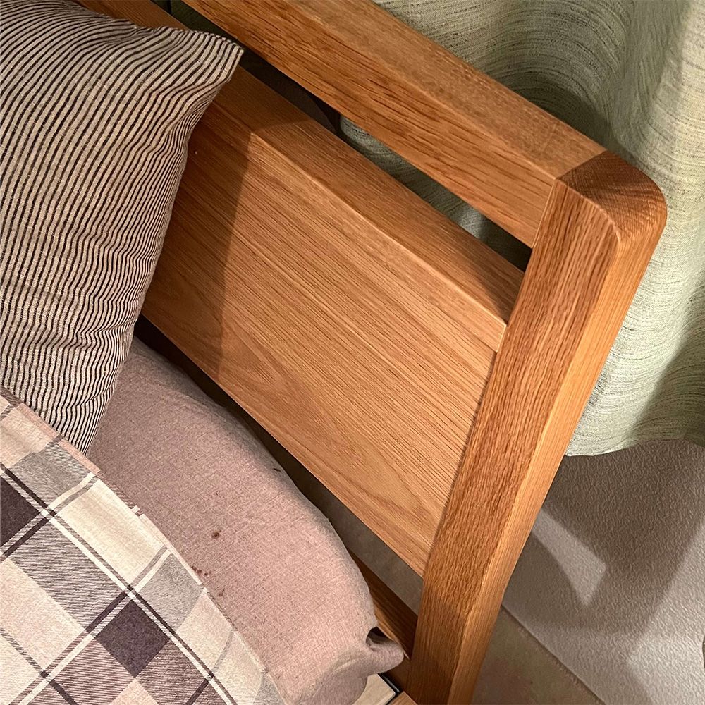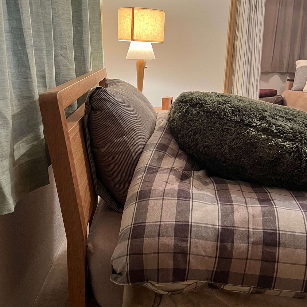 ベッドはフレームから足までオーク材を使用しています。オーク材はナチュラルで温かみのあるお部屋を演出でき、画像のように柄物のベッドカバーとも相性良し◎