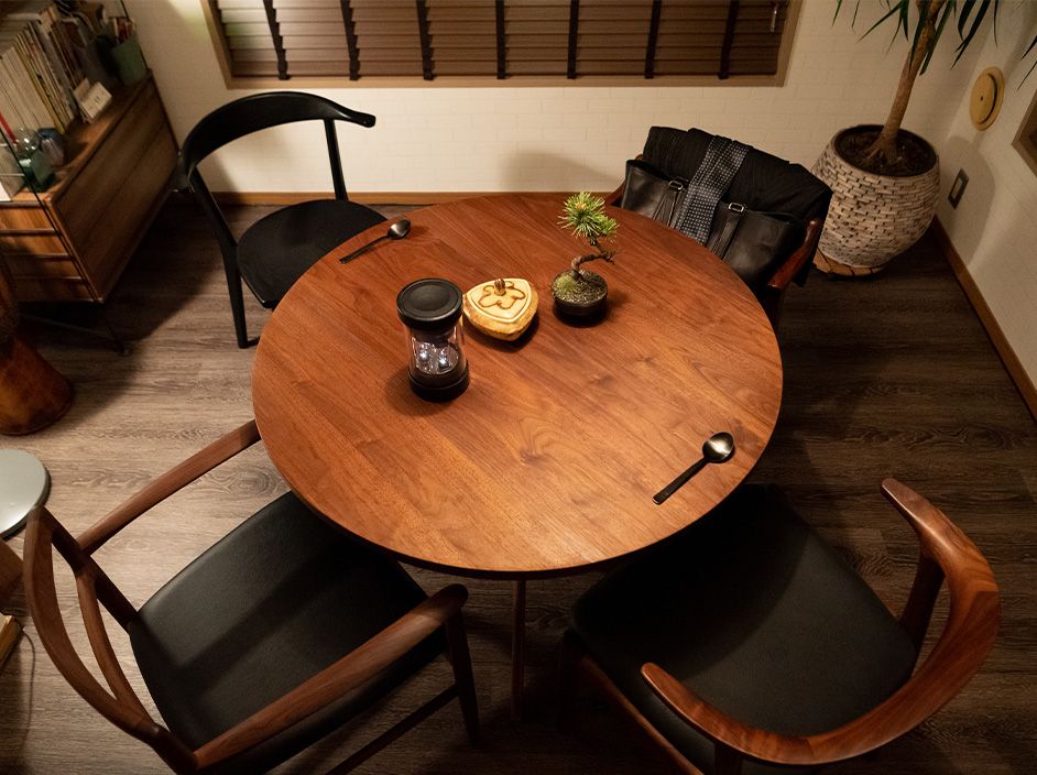 ダイニングシーンはウォールナット×黒を基調としていて、落ち着いた空間になってます。